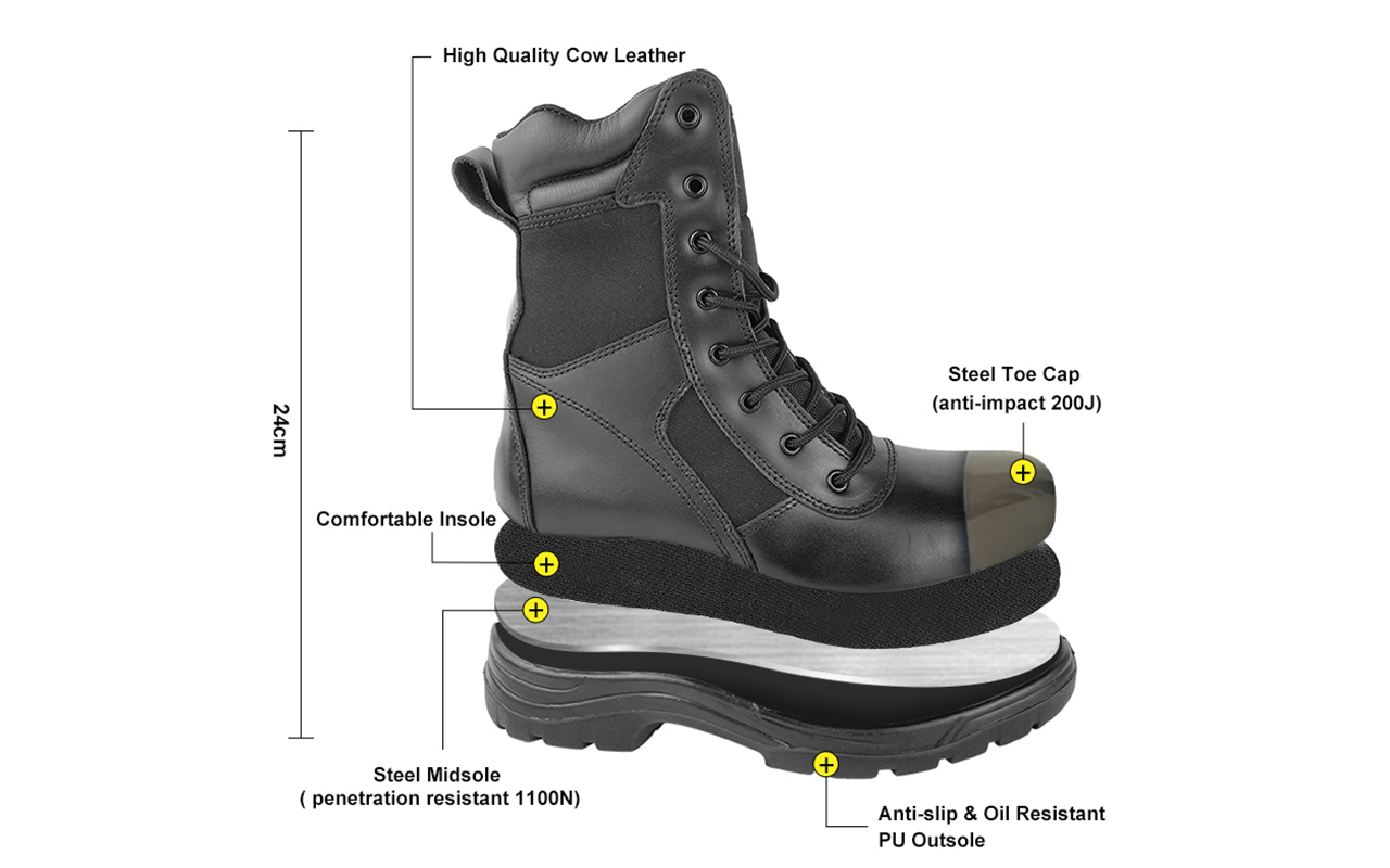 | Advantages of the boots | Army Safety Leather Shoes is a 9-inch height military boot. The military boot is an ideal choice for comfort, durability and power. |