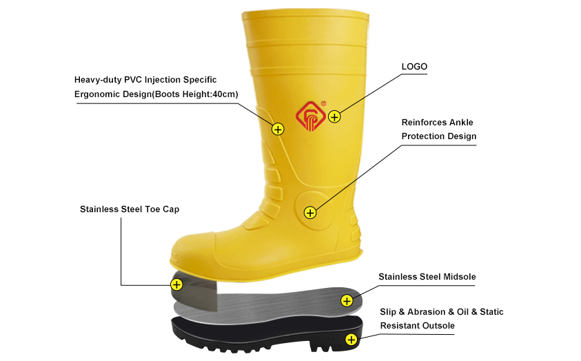 | Advantages | ·Excellent waterproof functionKeep your feet dry and comfortable during rainy days or in humid conditions.·Outstanding anti-slip featureMaintain stability on wet roads or muddy terrain to prevent slipping or loss of balance.·Heel energy absorption designMinimize the foot impact during walking or running, offering a more comfortable wearing experience and alleviating pressure on joints and muscles.·Oil resistant &anti-slipTo ensure good firmness and safety in wet conditions, the outsole is usually made of PVC to provide good grip and anti-slip properties.Prevents oil stains from corroding the surface of the boots and is easy to clean·Acid and alkali resistanceProtect the feet from damage caused by acidic or alkaline substances by preventing the erosion of shoe materials. |